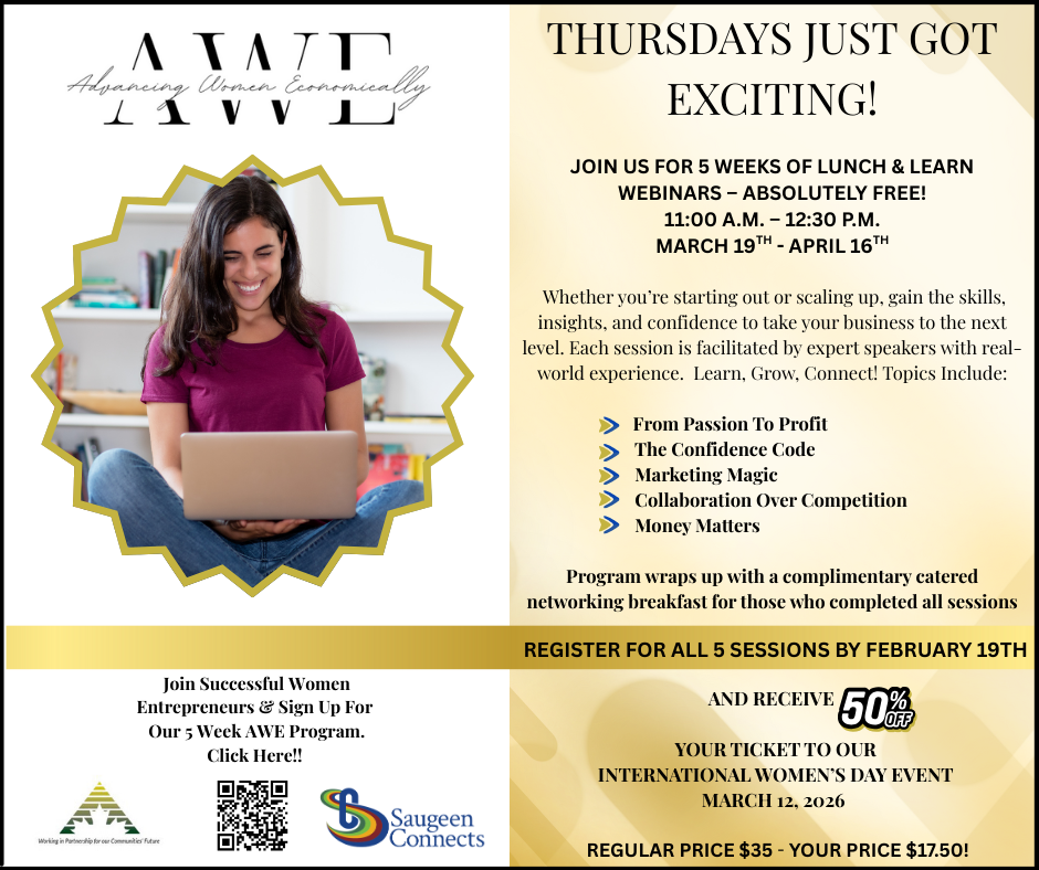 Saugeen Connects Hosts 5th Annual Advancing Women Economically (AWE) Series, Launching in Celebration of International Women’s Day. The AWE program is dedicated to helping women build and sustain successful businesses while strengthening their confidence as entrepreneurs.